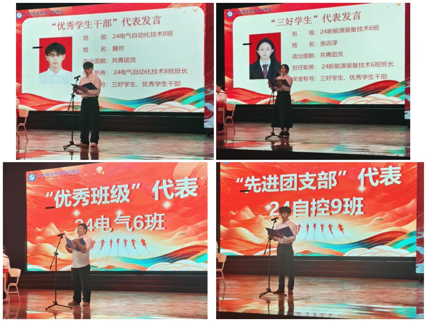 在接下来的获奖代表发言环节中。“先进团支部”代表2024级机电一体化(自控方向)9班岳鞠全分享了团支部在组织建设与思想引领方面的经验;“优秀班级”代表2024级电气自动化技术6班姜坤锐讲述了班级团结协作、共同进步的历程;“三好学生”代表2024新能源装备技术6班张远淳结合自身学习经历,鼓励同学们专注专业、勇于实践;“优秀学生干部”代表2024级电气自动化技术8班詹帅则从服务同学、锻炼能力的角度出发,表达了继续奉献的决心。