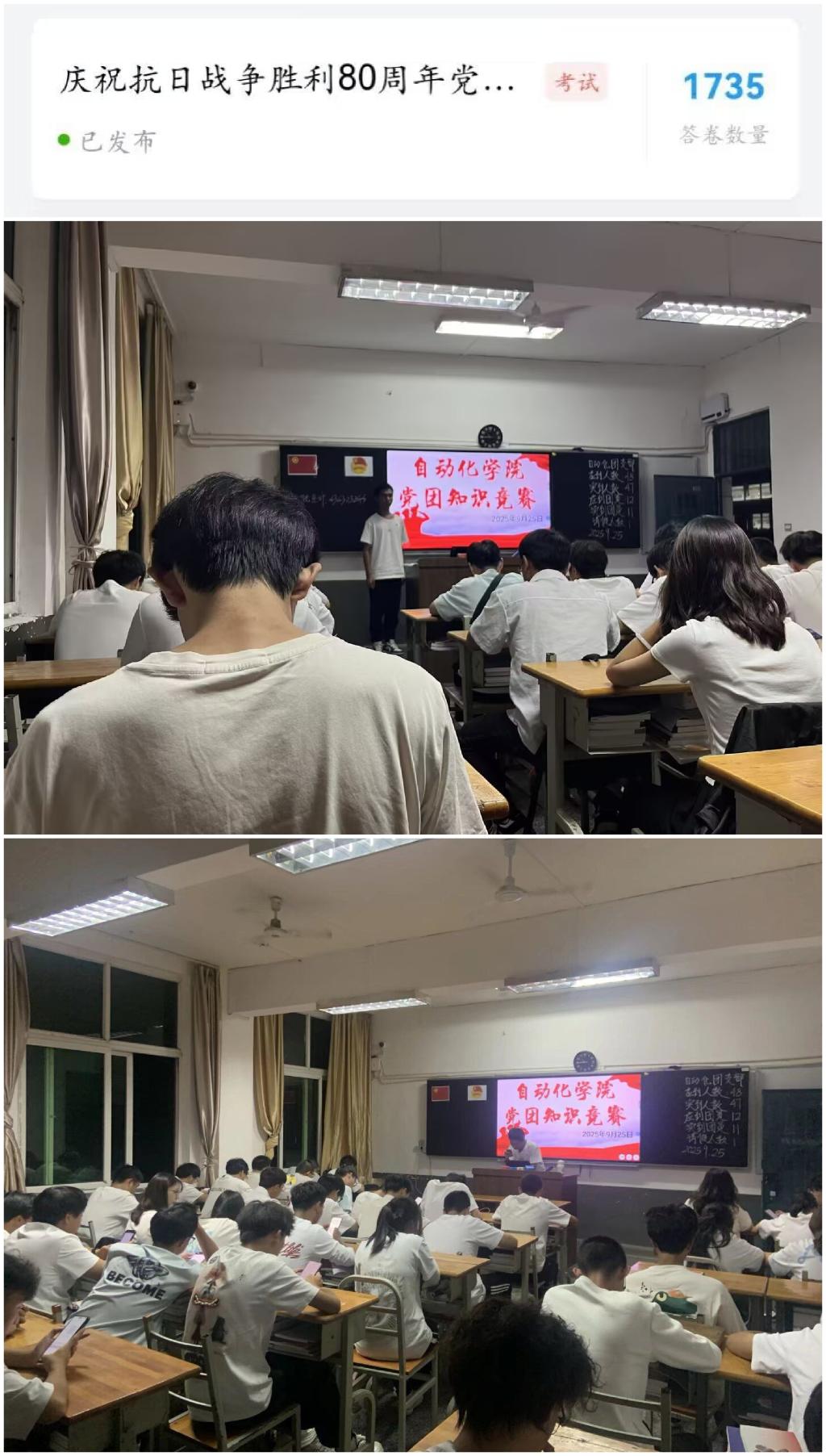 (自动化学院学生 李泽坤 审核:王静)为庆祝抗日战争胜利80周年,进一步加强学生的思想政治教育,增强党团组织的凝聚力和战斗力,自动化学院于2025年9月25日举办了“党团知识竞赛”活动。24、25级共计1735人参加。