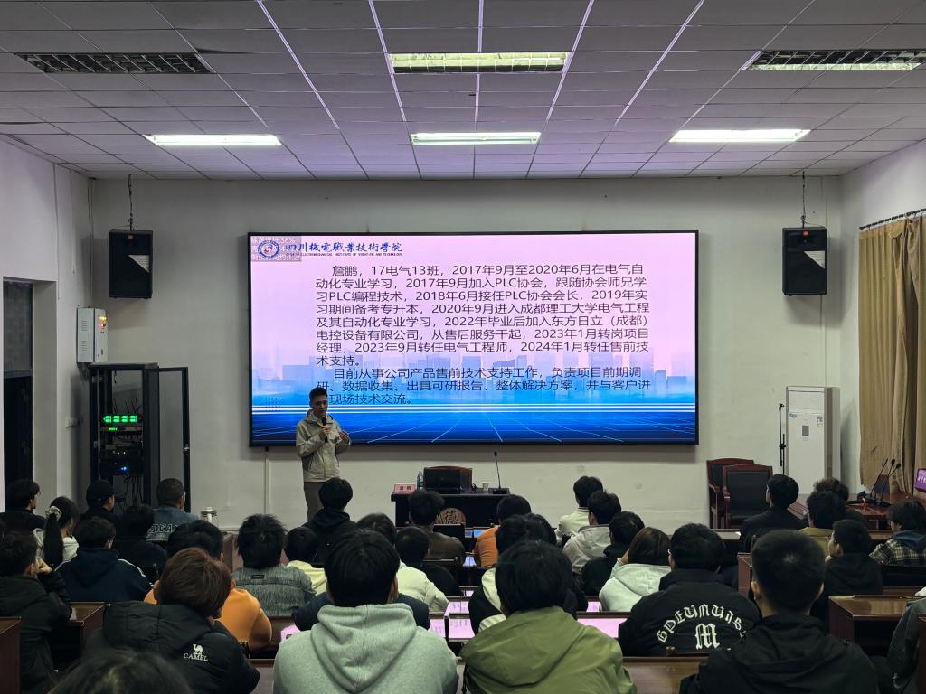 此次分享会邀请了2017级电气自动化专业优秀毕业生、第九届PLC协会会长詹鹏作为主讲嘉宾。詹鹏同学分享了自己从四川职业技术学院专科起步,通过不懈努力专升本至成都理工大学,并最终入职东方日立(成都)电控设备有限公司的成长轨迹。他详细回顾了在校期间担任PLC协会会长积累实践经验、实习期间备考深造,以及职业生涯中从售后服务岗位起步,历经项目经理、电气工程师,最终成长为一名专业的售前技术经理的奋斗历程。