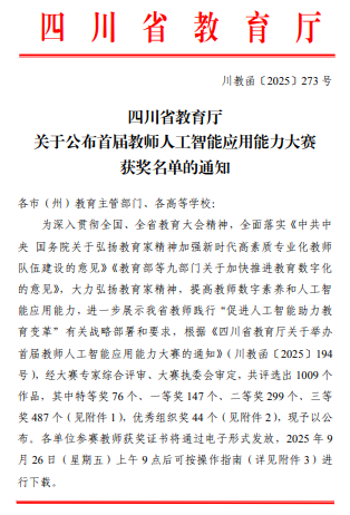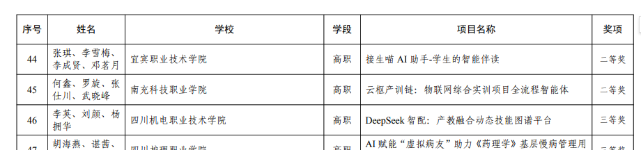 (自动化学院教师:刘颜 审核:王静)近日,四川省首届教师人工智能应用能力大赛顺利闭幕。在“AI智能体开发与创新应用”项目中,由我校自动化学院李英、刘颜、杨拥华团队开发的“DeepSeet智配:产教融合动态技能图谱平台”项目荣获三等奖。